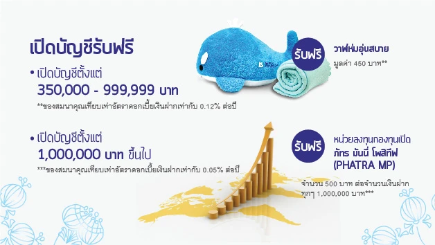 - เปิดบัญชีตั้งแต่ 350,000 - 999,999 บาท รับฟรี วาฬห่มอุ่นสบาย มูลค่า 450 บาท