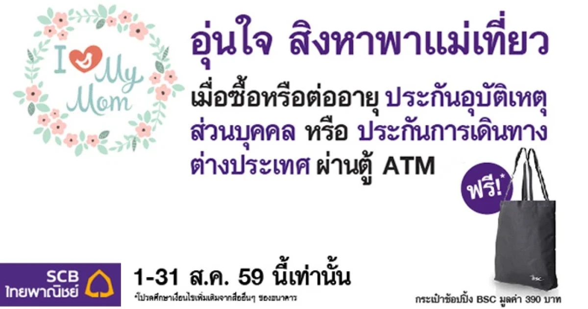 ฟรี! กระเป๋าช้อปปิ้ง BSC 1 ใบ มูลค่า 390 บาท เมื่อซื้อหรือต่ออายุ ประกันอุบัติเหตุส่วนบุคคล หรือ ประกันการเดินทางต่างประเทศ ผ่านตู้ ATM ธนาคารไทยพาณิชย์