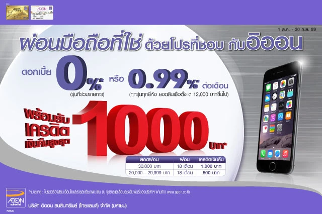 - ลูกค้าที่ทำรายการผ่อนโทรศัพท์มือถือ ระยะเวลา 18 เดือน โดยมียอดสินเชื่อตั้งแต่ 20,000 บาทขึ้นไป พร้อมกับลงทะเบียนเข้าร่วมรายการส่งเสริมการขาย จะได้รับเครดิตเงินคืนมูลค่า 500 - 1,000 บาท ตามเงื่อนไขที่บริษัทฯ กำหนดดังต่อไปนี้