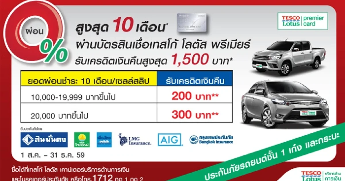 บัตรสินเชื่อเทสโก้ โลตัส พรีเมียร์ ให้สิทธิคุณผ่อน 0% นาน 10 เดือน พร้อมรับเครดิตเงินคืนสูงสุด 1,500 บาท (ตลอดรายการ) เมื่อซื้อประกันภัยรถยนต์ชั้น 1 สำหรับรถเก๋ง และรถกระบะ