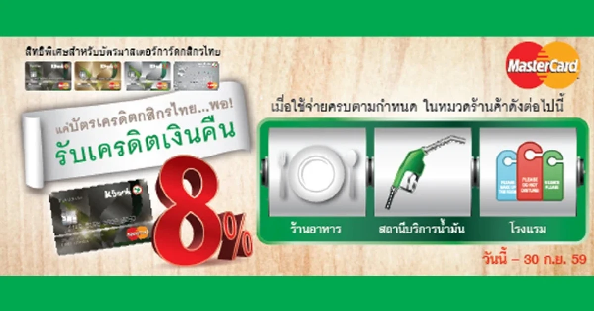 สิทธิพิเศษสำหรับ บัตรเครดิตมาสเตอร์การ์ดกสิกรไทย รับเครดิตเงินคืนสูงสุด 8% เมื่อใช้จ่ายครบ 800 บาทขึ้นไป/ เซลล์สลิป ในหมวดร้านอาหาร สถานีบริการน้ำมัน และโรงแรม และมียอดใช้จ่ายในหมวดร้านค้าอื่นรวม 10,000 บาทขึ้นไป/ เดือน