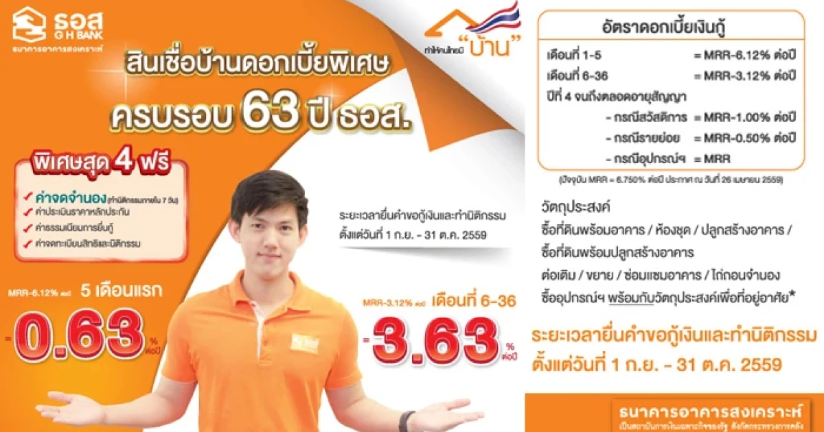 ธอส. มอบของขวัญ "อัตราดอกเบี้ยเงินกู้พิเศษ เนื่องในโอกาสครบรอบ 63 ปี ธอส." ให้อัตราดอกเบี้ยเงินกู้ต่ำนาน 3 ปีแรก พิเศษสุด 4 ฟรี! ได้แก่ ค่าจดจำนอง ค่าธรรมเนียมประเมินราคาหลักประกัน ค่าธรรมเนียมการยื่นกู้ และค่าจดทะเบียนสิทธิและนิติกรรม ทุกวงเงินกู้ ตั้งแต่วันนี้ - 31 ต.ค. 59