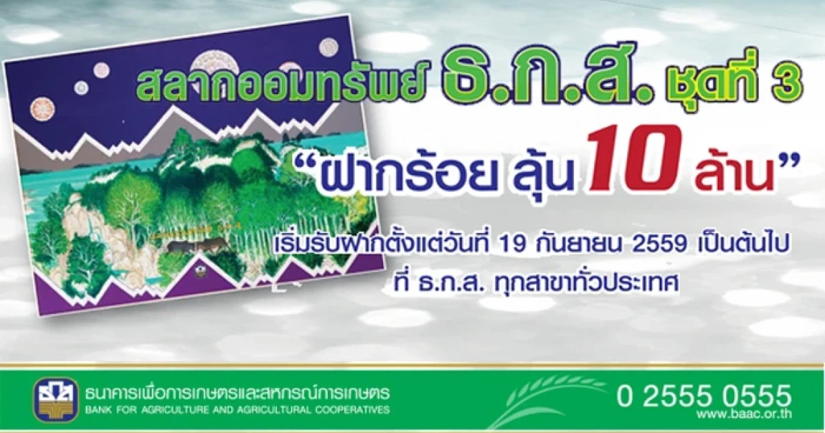 ฝาก 100 ลุ้น 10 ล้าน กับ สลากออมทรัพย์ ธ.ก.ส. ชุดที่ 3 เปิดรับฝากตั้งแต่ 19 ก.ย. 59 เป็นต้นไป