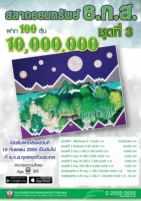 ฝาก 100 ลุ้น 10 ล้าน กับ สลากออมทรัพย์ ธ.ก.ส. ชุดที่ 3 จาก ธนาคารเพื่อการเกษตรและสหกรณ์การเกษตร จำหน่ายราคาหน่วยละ 100 บาท เปิดรับฝากตั้งแต่ 19 ก.ย. 59 เป็นต้นไป