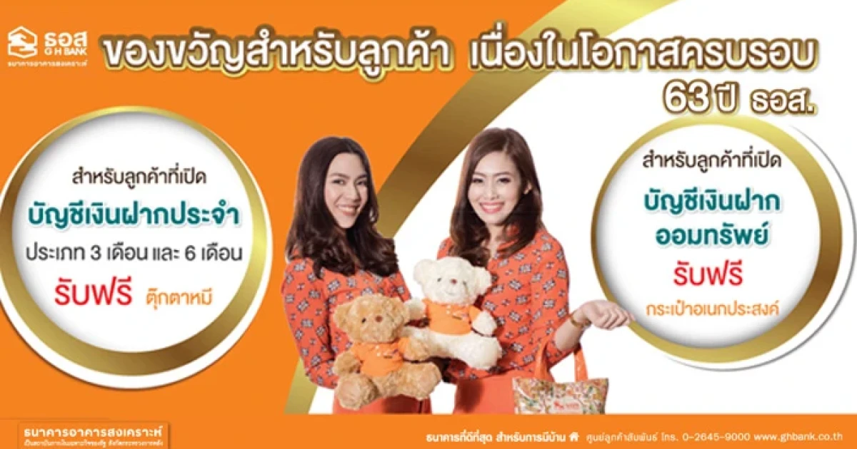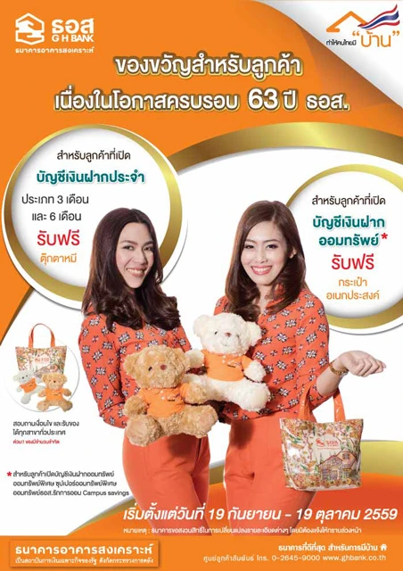 ของขวัญสำหรับลูกค้า เนื่องในโอกาสครบรอบ 63 ปี ธอส. รับฟรี! ตุ๊กตาหมีน่ารัก เมื่อเปิดบัญชีเงินฝากประจำ 3 เดือน และ 6 เดือน หรือรับกระเป๋าอเนกประสงค์ เมื่อเปิดบัญชีเงินฝากออมทรัพย์พิเศษ, บัญชีเงินฝากซุปเปอร์ออมทรัพย์พิเศษ, บัญชีเงินฝากธอส. รักการออม และบัญชีเงินฝาก Campus Savings