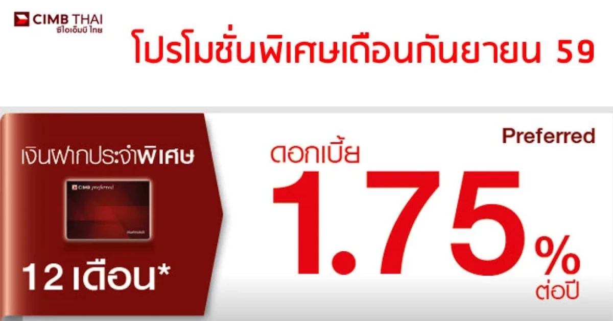 บัญชีเงินฝากประจำพิเศษ 12 เดือน ดอกเบี้ยสูง ประจำเดือนกันยายน 2559 ให้ดอกเบี้ยโบนัสจาก ธนาคารซีไอเอ็มบี ไทย จำกัด (มหาชน) สามารถเปิดได้ทุกสาขา