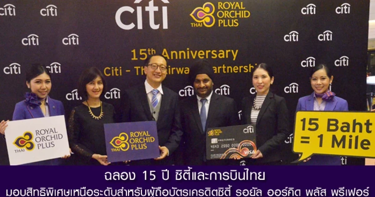ธนาคารซิตี้แบงก์และการบินไทย เฉลิมฉลองครบรอบ 15 ปี แห่งความร่วมมือด้วยการมอบสิทธิพิเศษเหนือระดับให้แก่นักเดินทางด้วยอภิสิทธิ์ที่เหนือกว่าสำหรับผู้ถือบัตรซิตี้ รอยัล ออร์คิด พลัส พรีเฟอร์