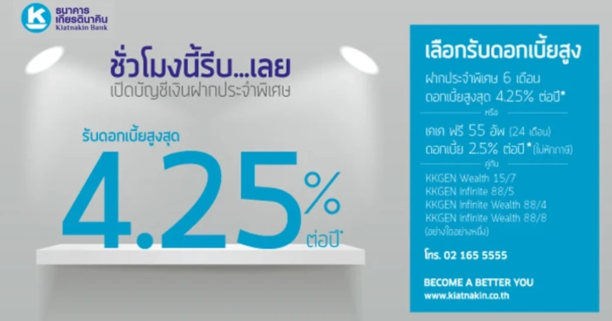 ธ.เกียรตินาคิน มอบดอกเบี้ยสูงสุด 4.25% ต่อปี เมื่อเปิดบัญชีเงินฝากประจำ คู่กับการซื้อประกันชีวิต