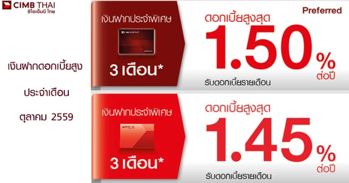 ธนาคารซีไอเอ็มบี ไทย ออกเงินฝากประจำพิเศษ ประจำเดือนตุลาคม 2559 ด้วยบัญชีเงินฝากประจำพิเศษ 3 เดือน สำหรับลูกค้าบุคคลธรรมดา และลูกค้าบุคคลธรรมดา Preferred โดยให้ดอกเบี้ยสูงสุดสำหรับ
