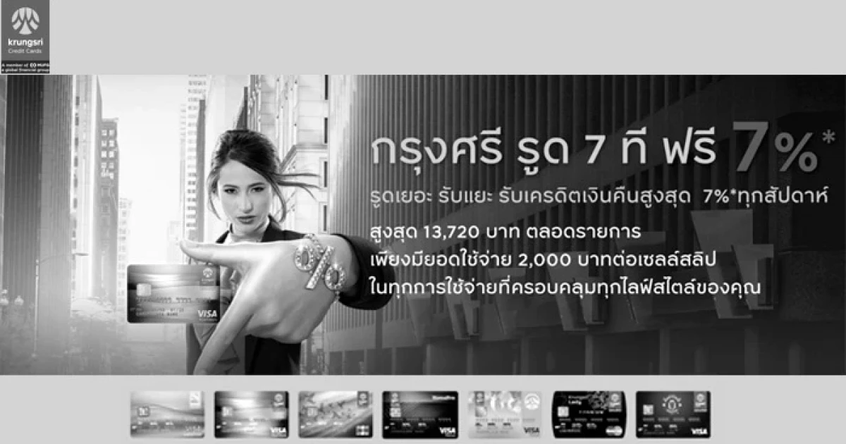 รูด 7 ที ฟรี 7% รูดเยอะ รับแยะ.. รับเครดิตเงินคืนสูงสุด 7% ทุกสัปดาห์ เมื่อใช้จ่ายผ่านบัตรเครดิตกรุงศรี