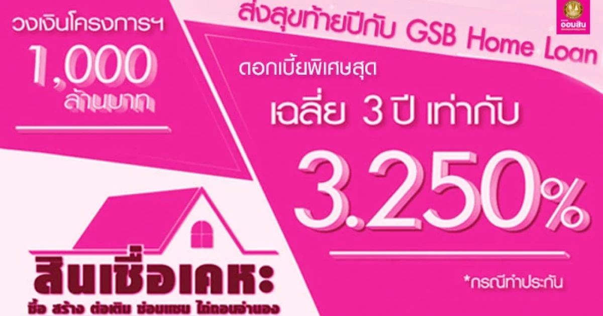 ส่งสุขท้ายปี กับ GSB Home Loan สินเชื่อเคหะ จาก ธ.ออมสิน ให้กู้เพื่อซื้อ สร้าง ต่อเติม ซ่อมแซม และไถ่ถอนจำนอง อัตราดอกเบี้ยเฉลี่ย 3 ปี ต่ำสุดเท่ากับ 3.25% ต่อปี