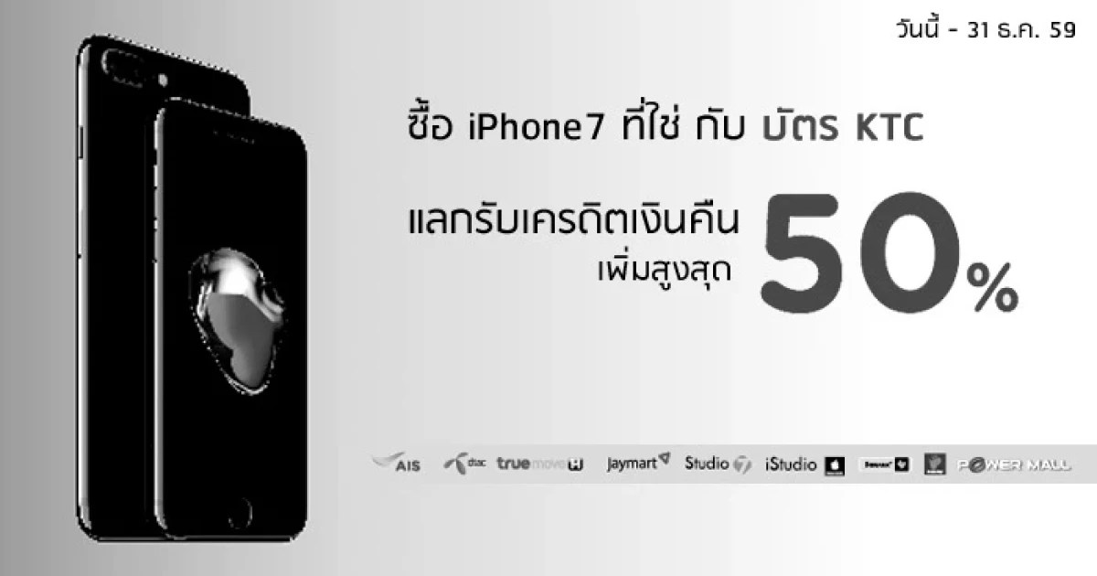 ซื้อ iPhone 7 กับบัตรเครดิต KTC รับสิทธิ์ผ่อน 0% นาน 10 เดือน พร้อมแลกรับเครดิตเงินคืนสูงสุด 50%