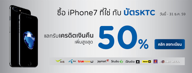 - เครดิตเงินคืนสูงสุด 3% เฉพาะการแบ่งชำระ KTC Flexi 0% iPhone 7 และ 7 Plus รุ่นที่กำหนด ผ่านบัตรเครดิต KTC ที่ทำรายการโดยใช้รหัสสินค้าที่ KTC กำหนด โดยเป็นสินค้าศูนย์ AIS / DTAC / TRUE / Jaymart ที่ร้านค้าสาขาที่ร่วมรายการเท่านั้น