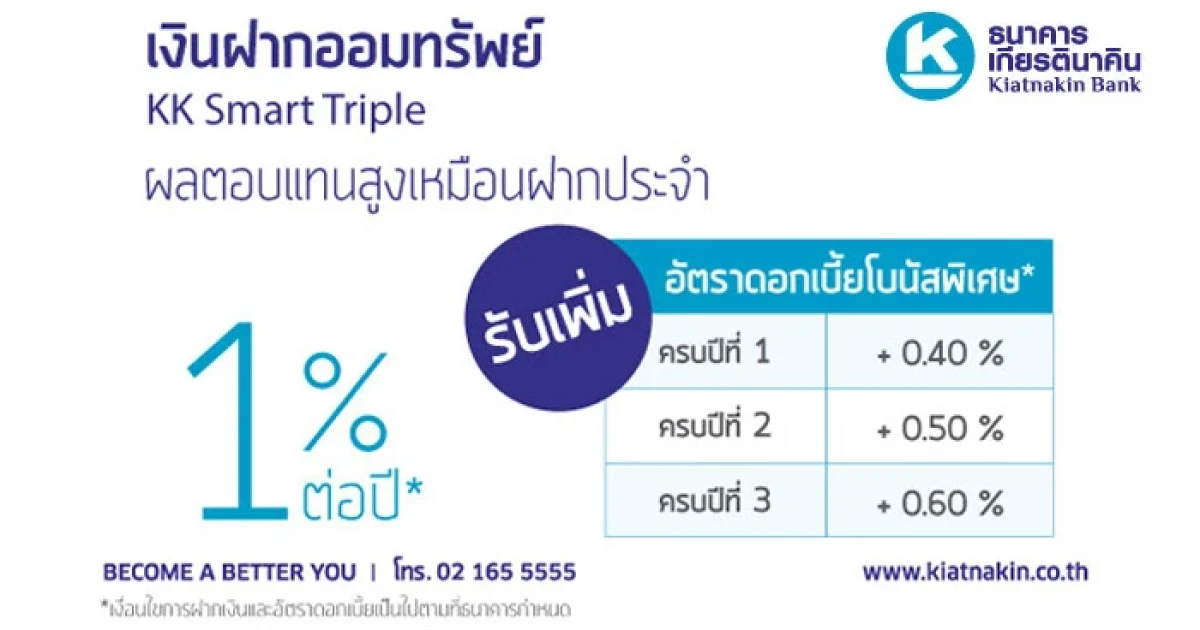 บัญชีเงินฝากออมทรัพย์ KK Smart Triple จาก ธ.เกียรตินาคิน ผลตอบแทนสูงเหมือนเงินฝากประจำ รับเพิ่ม! อัตราดอกเบี้ยโบนัสพิเศษทุกปี เป็นระยะเวลา 3 ปี เปิดบัญชีขั้นต่ำ 50,000 บาท