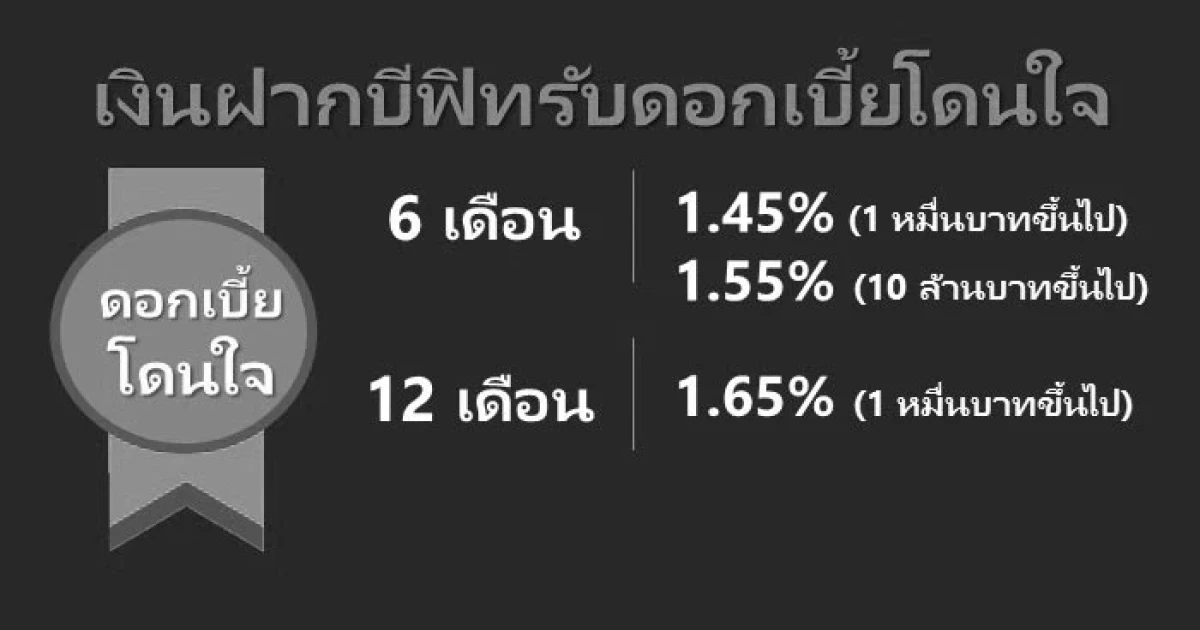 - 6 เดือน รับดอกเบี้ยในอัตรา 1.45% ต่อปี เมื่อฝาก 1 หมื่นบาทขึ้นไป