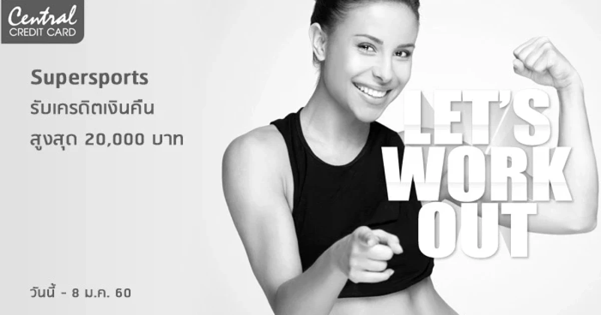 Let's Work Out! รับสิทธิพิเศษ 3 ต่อ สุดคุ้ม ส่วนลดสูงสุด 22% พร้อมรับเครดิตเงินคืนสูงสุด 20,000 บาท เมื่อช้อปที่ Supersports และร้านค้าอื่นๆ อาทิ GO Sports, FIT Sports, CROSS, New Balance, SKECHERS ในเครือ CRC Sports ทุกสาขาที่ร่วมรายการ และชำระผ่านบัตรเซ็นทรัล เครดิตคาร์ด