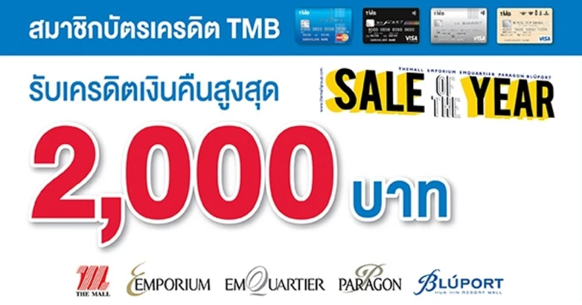 Sale of The Year รับเครดิตเงินคืนสูงสุด 2,000 บาท เมื่อมียอดใช้จ่ายตามที่กำหนด ณ ห้างสรรพสินค้าที่ร่วมรายการ อาทิ เดอะมอลล์ทุกสาขา, เอ็มโพเรียม, เอ็มควอเทียร์, พารากอน และบลูพอร์ต ผ่านบัตรเครดิต TMB