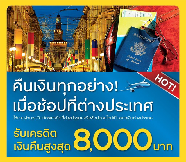 คืนเงินทุกอย่าง! เมื่อช้อปที่ต่างประเทศ.. รับเครดิตเงินคืนสูงสุด 8,000 บาท เมื่อใช้จ่ายที่ต่างประเทศหรือช้อปออนไลน์เป็นสกุลเงินต่างประเทศ ผ่านบัตรเครดิตกรุงศรี เฟิร์สช้อยส์