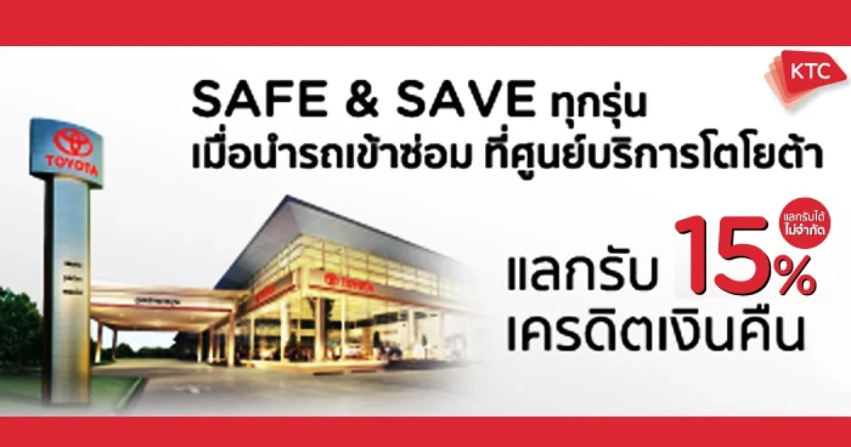 SAFE & SAVE ทุกรุ่น แลกรับเครดิตเงินคืนสูงสุด 15% (แลกรับได้ไม่จำกัด) เมื่อนำรถเข้าซ่อม ที่ศูนย์บริการโตโยต้า เพียงชำระค่าบริการผ่านบัตรเครดิต KTC ครบทุก 1,000 บาท และใช้คะแนนสะสม KTC Forever Rewards ทุก 1,000 คะแนน