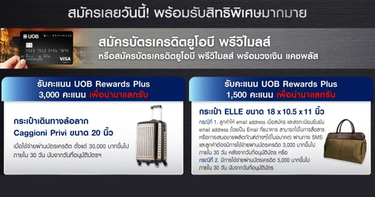 - รับคะแนน UOB Rewards Plus 3,000 คะแนน เพื่อนำมาแลกรับ กระเป๋าเดินทางล้อลาก Caggioni ขนาด 20 นิ้ว เมื่อใช้จ่ายผ่านบัตรเครดิต ตั้งแต่ 30,000 บาทขึ้นไป ภายใน 30 วัน นับจากวันที่อนุมัติบัตร