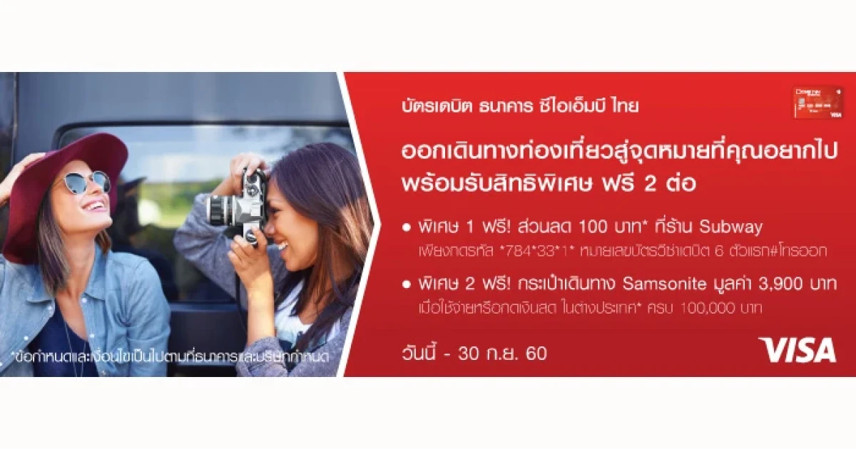 ออกเดินทางท่องเที่ยวสู่จุดหมายที่คุณอยากไป.. พร้อมรับสิทธิพิเศษ ฟรี 2 ต่อ จากบัตรเดบิต ธนาคารซีไอเอ็มบี ไทย