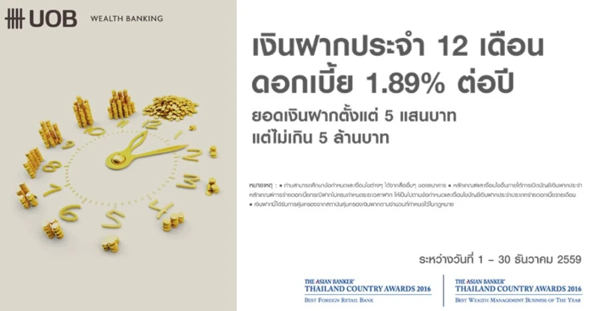 เงินฝากประจำ 12 เดือน ดอกเบี้ยสูง 1.89% ต่อปี จาก ธ.ยูโอบี