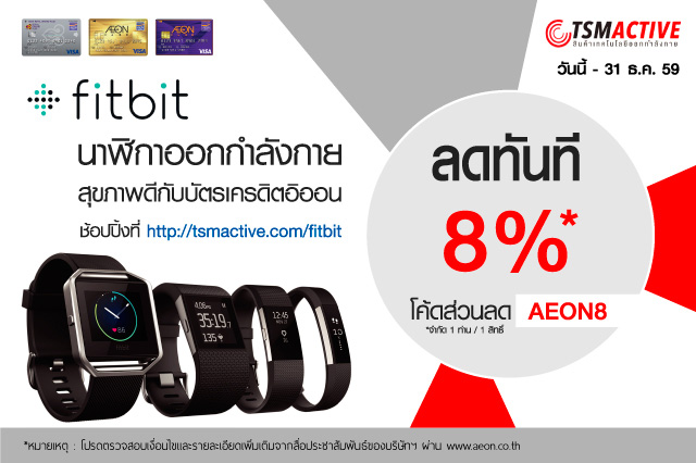 สิทธิพิเศษสำหรับสมาชิกผู้ถือบัตรเครดิตอิออน รับส่วนลด 8% เมื่อช้อปสินค้า fitbit ผ่านเว็บไซต์ http://tsmactive.com/fitbit โดยใช้โค้ดส่วนลด "AEON8" และชำระผ่านบัตรเครดิตอิออน