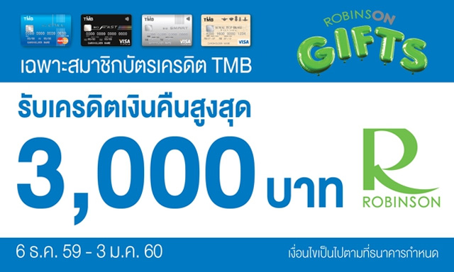 สิทธิพิเศษสำหรับสมาชิกบัตรเครดิต TMB รับเครดิตเงินคืนสูงสุด 3,000 บาท เมื่อมียอดช้อปที่ห้างโรบินสันทุกสาขาที่ร่วมรายการตามที่กำหนด (รับเครดิตเงินคืนสูงสุด 3,000 บาท/ บัตรตลอดรายการ)