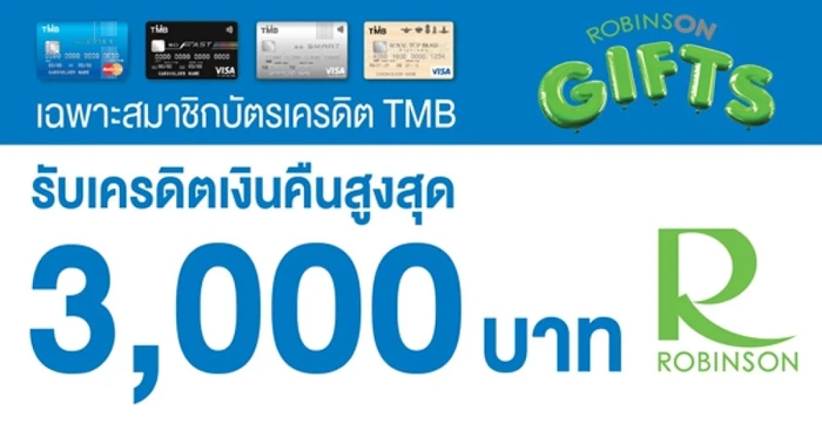สิทธิพิเศษสำหรับสมาชิกบัตรเครดิต TMB รับเครดิตเงินคืนสูงสุด 3,000 บาท เมื่อมียอดช้อปที่ห้างโรบินสันทุกสาขาที่ร่วมรายการตามที่กำหนด (รับเครดิตเงินคืนสูงสุด 3,000 บาท/ บัตรตลอดรายการ)