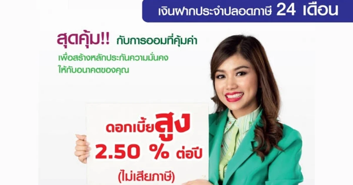 เงินฝากประจำปลอดภาษี 24 เดือน ดอกเบี้ยสูง 2.50% ไม่เสียภาษี จาก ธ.ก.ส.