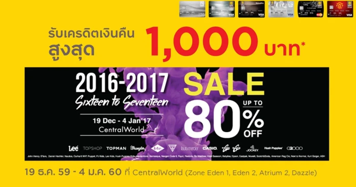 - สำหรับยอดใช้จ่ายจากเซลล์สลิปที่ใช้จ่ายภายใต้ชื่อเจ้าของบัตรและหมายเลขบัตรเครดิตเดียวกัน ที่ใช้จ่ายภายในงาน CMG Sixteen to Seventeen Sale ที่ CentralWorld (Zone Eden 1, Eden 2, Atrium 2, Dazzle) ระหว่างวันที่ 19 ธ.ค. 59 - 4 ม.ค. 60