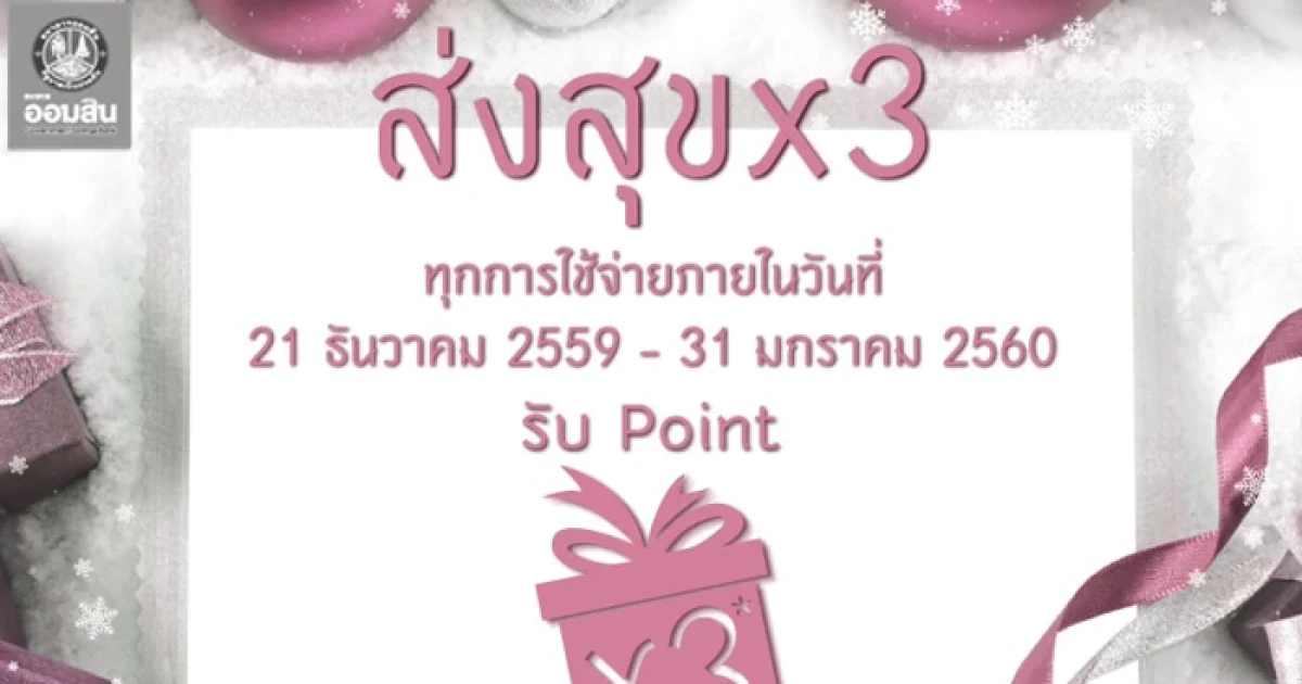เทศกาลปีใหม่ถึงตรุษจีนนี้ มาร่วมส่งความสุขด้วยการใช้จ่ายผ่านบัตรเครดิตธนาคารออมสิน.. รับคะแนนสะสม x3 ทุกการใช้จ่ายระหว่างวันที่ 21 ธ.ค. 59 - 31 ม.ค. 60 (รับคะแนนสูงสุดจากที่คูณแล้ว 20,000 คะแนน/ บัตร/ ระยะเวลาที่ทำกิจกรรม)