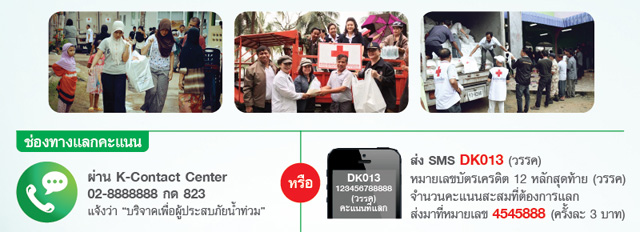 บัตรเครดิตกสิกรไทย ขอเชิญร่วมช่วยเหลือ "ผู้ประสบอุทกภัยภาคใต้" ผ่านสภากาชาดไทย ด้วยการแลกคะแนนสะสม KBank Reward Point ทุกๆ 1,000 คะแนน แทนเงินบริจาค 100 บาท