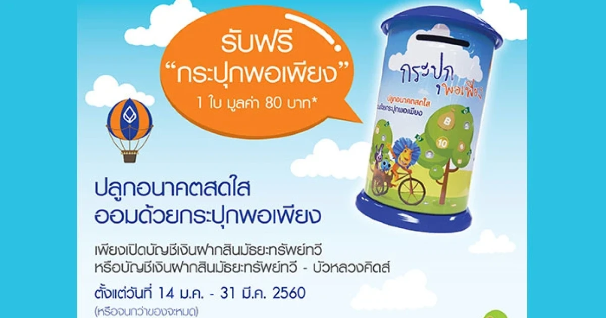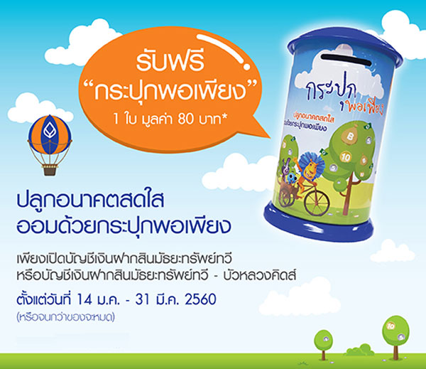 รับฟรี!! "กระปุกพอเพียง" 1 ใบ มูลค่า 80 บาท เพียงเปิดบัญชีเงินฝากสินมัธยะทรัพย์ทวี ตั้งแต่ 1,000 บาทขึ้นไป หรือบัญชีเงินฝากสินมัธยะทรัพย์ทวี - บัวหลวงคิดส์ ตั้งแต่ 500 บาทขึ้นไป ตั้งแต่วันที่ 14 ม.ค. - 31 มี.ค. 60 (หรือจนกว่าของจะหมด)