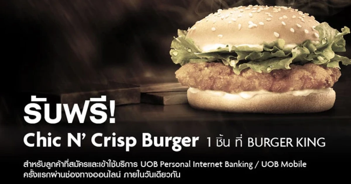 - ลูกค้าที่สมัครและเข้าใช้บริการ UOB Personal Internet Banking / UOB Mobileภายในเดือนพฤศจิกายน 2559 สามารถแลกรับ Chic N' Crisp Burger ที่ร้าน Burger King ได้ถึงวันที่ 31 ธ.ค. 59 เท่านั้น