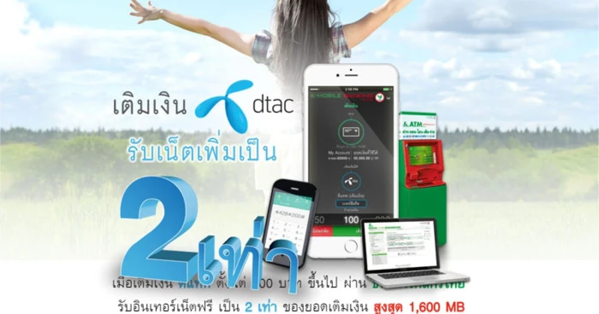 รับเน็ตเพิ่มเป็น 2 เท่า เมื่อเติมเงิน "ดีแทค" ผ่าน ธ.กสิกรไทย