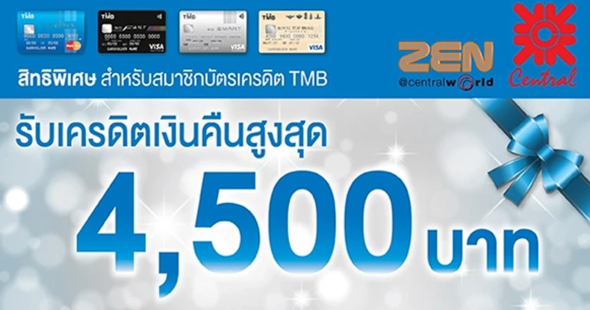 รับเครดิตเงินคืนสูงสุด 4,500 บาท เมื่อช้อปที่เซ็นทรัลทุกสาขาและเซน ผ่านบัตรเครดิต TMB