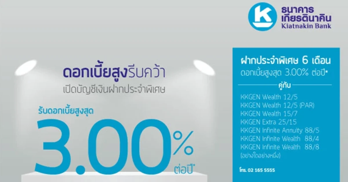 ดอกเบี้ยสูงรีบคว้า เปิดบัญชีเงินฝากประจำพิเศษ 6 เดือน คู่ประกันชีวิต รับดอกเบี้ยสูงสุด 3.00% ต่อปี