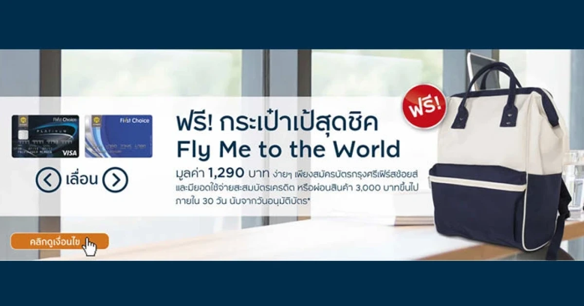 ฟรี! กระเป๋าเป้สุดชิค Fly Me to the World มูลค่า 1,290 บาท ง่ายๆ เพียงสมัครบัตรกรุงศรีเฟิร์สช้อยส์ และมียอดใช้จ่ายสะสมบัตรเครดิต หรือผ่อนสินค้า 3,000 บาทขึ้นไป ภายใน 30 วัน นับจากวันอนุมัติบัตร