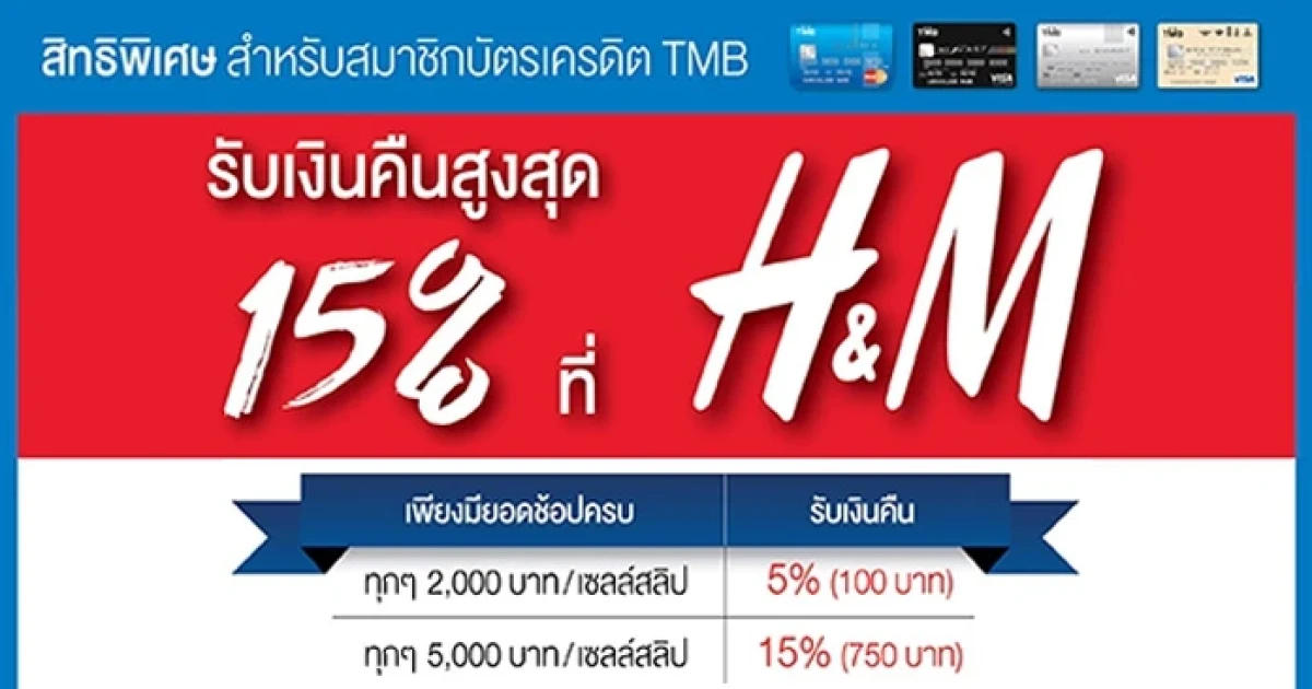 - เมื่อใช้จ่ายผ่านบัตรเครดิต TMB ครบทุกๆ 2,000 บาทขึ้นไป/ เซลล์สลิป รับเงินคืนเข้าบัญชีบัตรฯ 100 บาท ยอดใช้จ่ายครบทุกๆ 5,000 บาทขึ้นไป/ เซลล์สลิป รับเงินคืนเข้าบัญชีบัตร 750 บาท (รวมสูงสุด 1,500 บาท/ หมายเลขบัตร ตลอดรายการ) เมื่อใช้จ่ายผ่านบัตรฯ ที่ H&M ทุกสาขา ระหว่างวันที่ 15 มี.ค. - 31 พ.ค. 60 โดยยอดใช้จ่ายดังกล่าว ไม่รวม ยอดใช้จ่ายที่เกิดจากการซื้อบัตรของขวัญทุกประเภท ยอดใช้จ่ายในเชิงธุรกิจ ยอดใช้จ่ายที่ถูกยกเลิก และยอดใช้จ่ายที่มีการคืนสินค้าภายหลัง