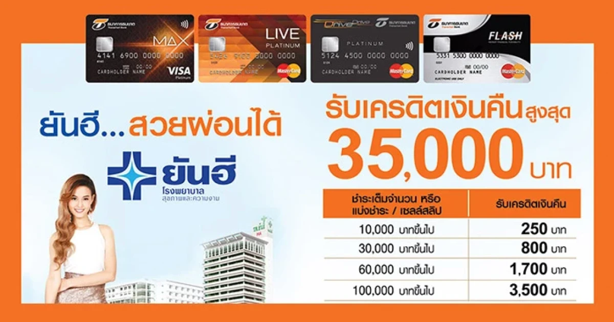 ยันฮี.. สวยผ่อนได้ รับเครดิตเงินคืนสูงสุด 35,000 บาท เมื่อมียอดใช้จ่ายที่ รพ. ยันฮี ผ่านบัตรเครดิตธนชาต