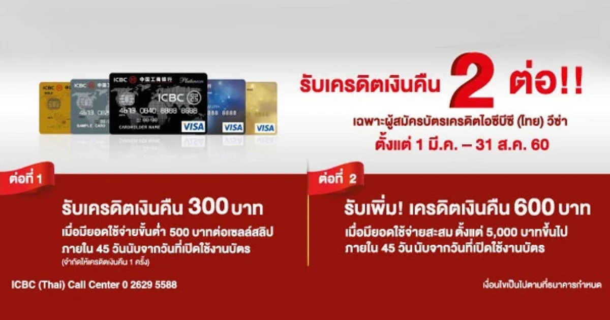 สมัครบัตรเครดิตไอซีบีซี (ไทย) วีซ่า วันนี้ รับเครดิตเงินคืน 2 ต่อ!! ใช้จ่ายผ่านบัตรฯ 500 บาท รับคืน 300 บาท ใช้ครบ 5,000 บาท รับเพิ่มอีก 600 บาท