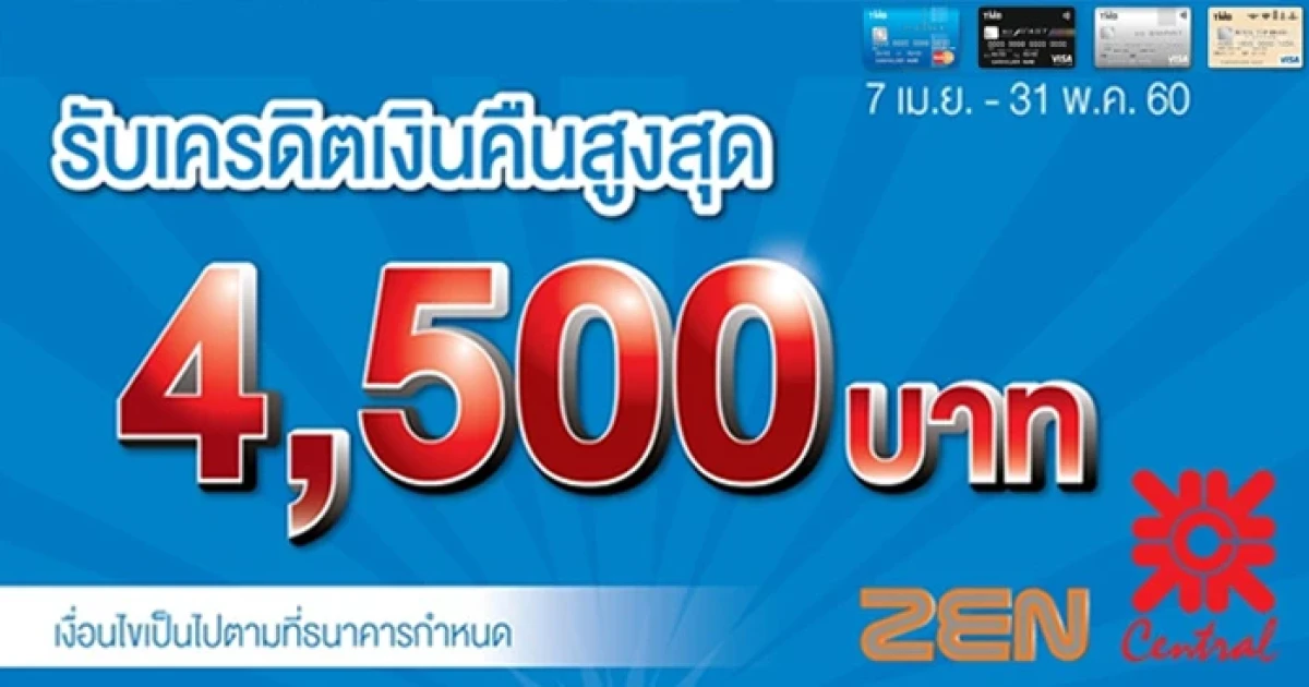 รับเครดิตเงินคืนสูงสุด 4,500 บาท เพียงมียอดช้อปที่เซ็นทรัลทุกสาขา และเซน ผ่านบัตรเครดิต TMB ตามยอดที่กำหนด