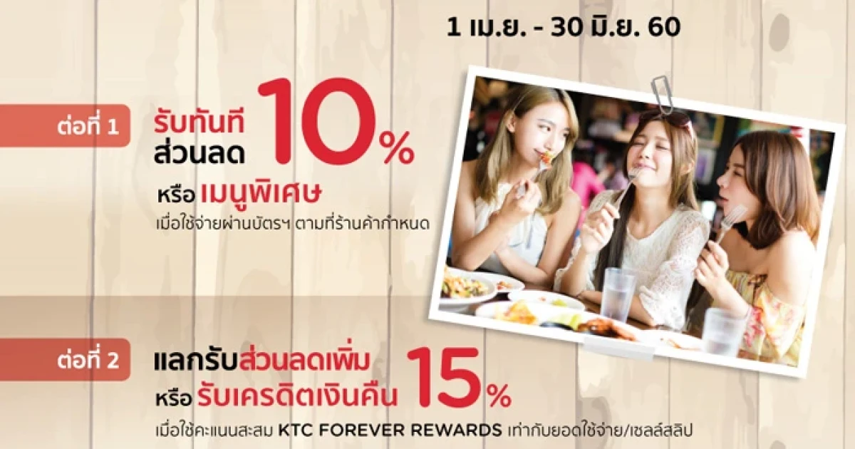 - ต่อที่ 2 แลกรับส่วนลดเพิ่ม หรือรับเครดิตเงินคืน 15% เมื่อใช้คะแนนสะสม KTC Forever Rewards เท่ากับยอดใช้จ่าย/ เซลล์สลิป