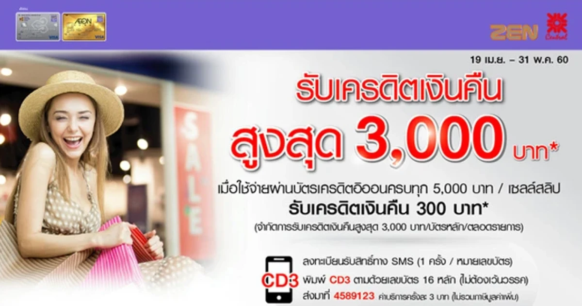 รับเครดิตเงินคืนสูงสุด 3,000 บาท เมื่อใช้จ่ายผ่านบัตรเครดิตอิออนครบทุก 5,000 บาท/ เซลล์สลิป ณ ห้างสรรพสินค้าเซ็นทรัลทุกสาขาและเซน (จำกัด 3,000 บาท/ บัตรหลัก/ ตลอดระยะเวลาส่งเสริมการขาย)