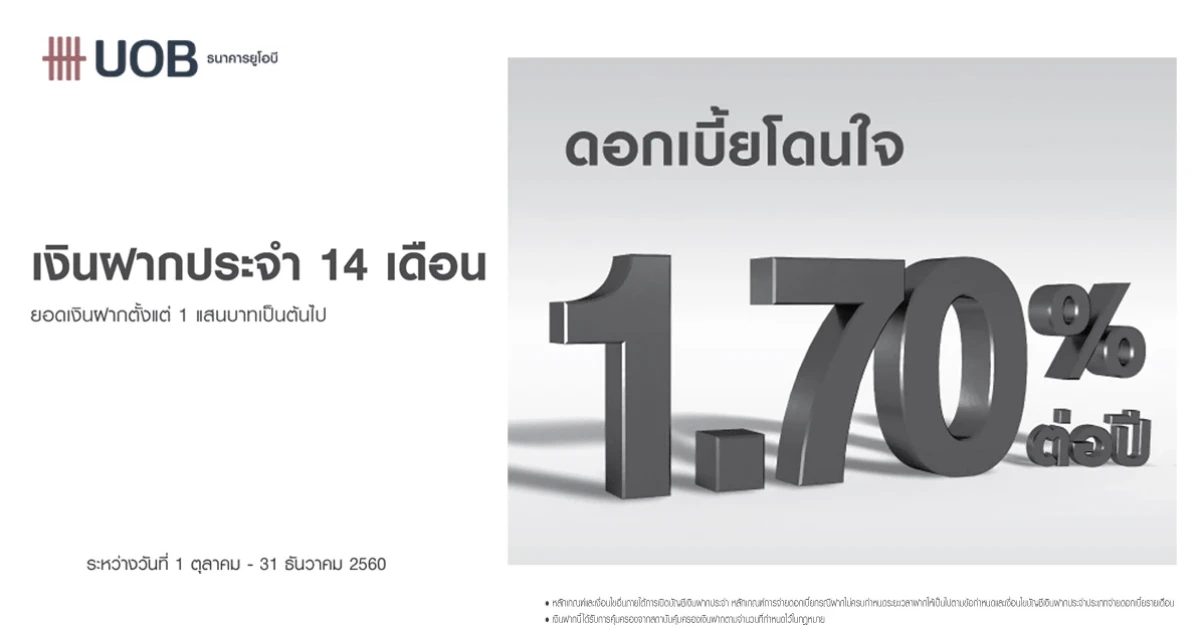 เงินฝากประจำ ระยะเวลาฝาก 14 เดือน ดอกเบี้ยโดนใจ สูงถึง 1.70% ต่อปี จาก ธ.ยูโอบี