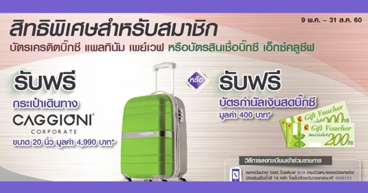 - รับฟรี กระเป๋าล้อลาก CAGGIONI Corporate ขนาด 20 นิ้ว มูลค่า 4,990 บาท เมื่อมียอดใช้จ่ายสะสมผ่านบัตรครบ 10,000 บาท ภายใน 60 วันนับจากวันที่ได้รับอนุมัติ