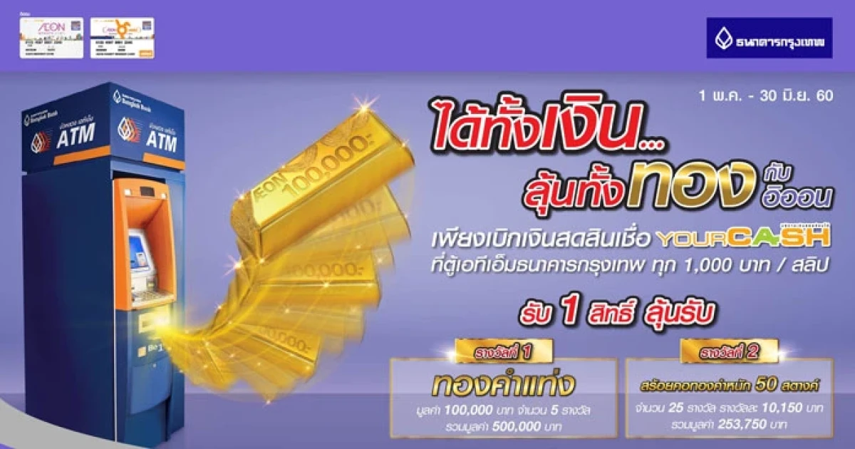 ได้ทั้งเงิน...ลุ้นทั้งทอง กับอิออน เพียงเบิกเงินสดสินเชื่อ YourCash ที่ตู้ ATM ธ.กรุงเทพ