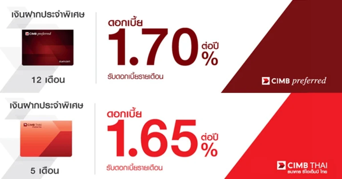 บัญชีเงินฝากประจำพิเศษ 12 เดือน อัตราดอกเบี้ย 1.70% ต่อปี สำหรับลูกค้า CIMB Preferred