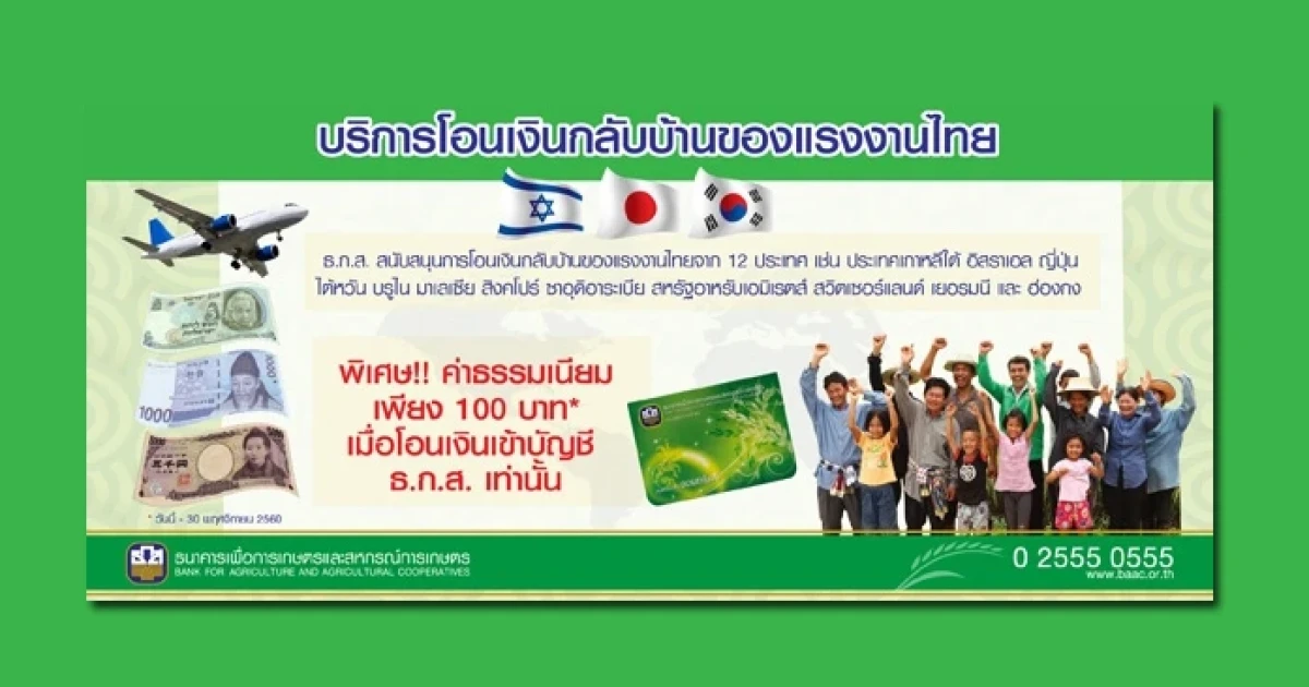 บริการโอนเงินกลับบ้านของแรงงานไทยในต่างแดน ค่าธรรมเนียมเพียง 100 บาท เมื่อโอนเข้าบัญชี ธ.ก.ส.